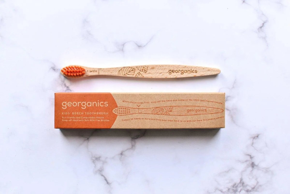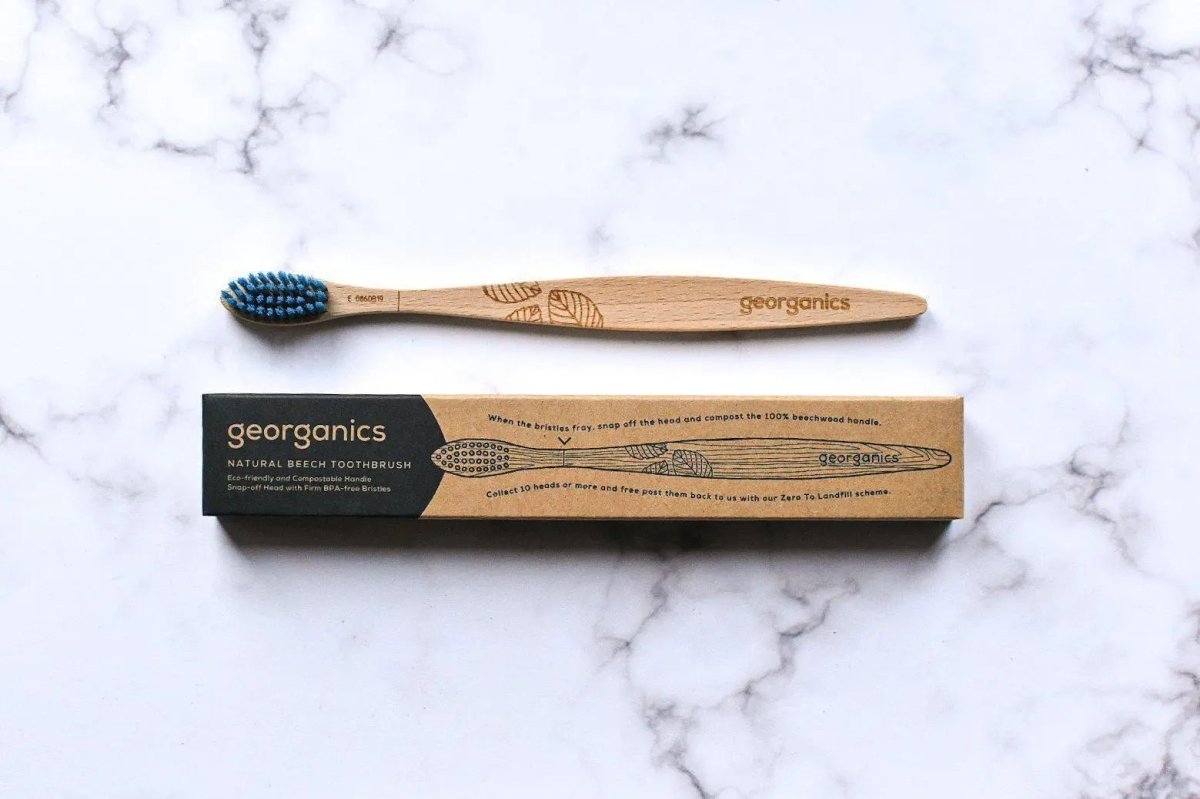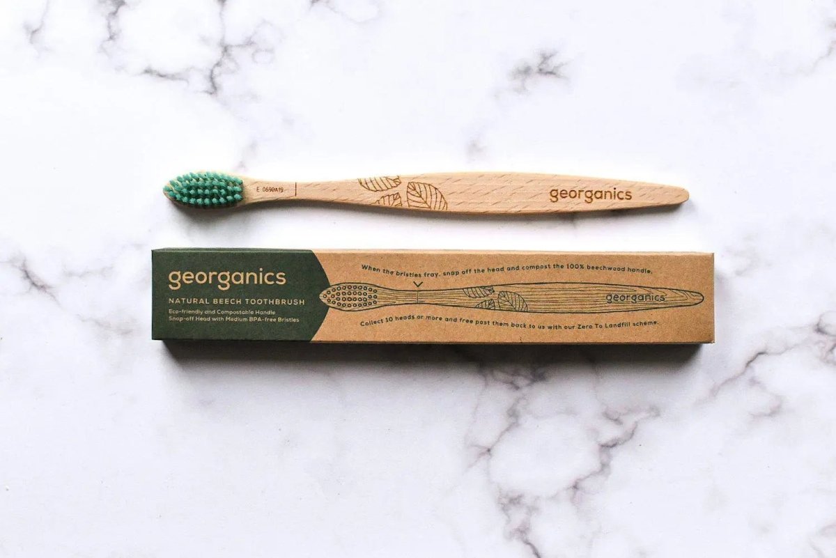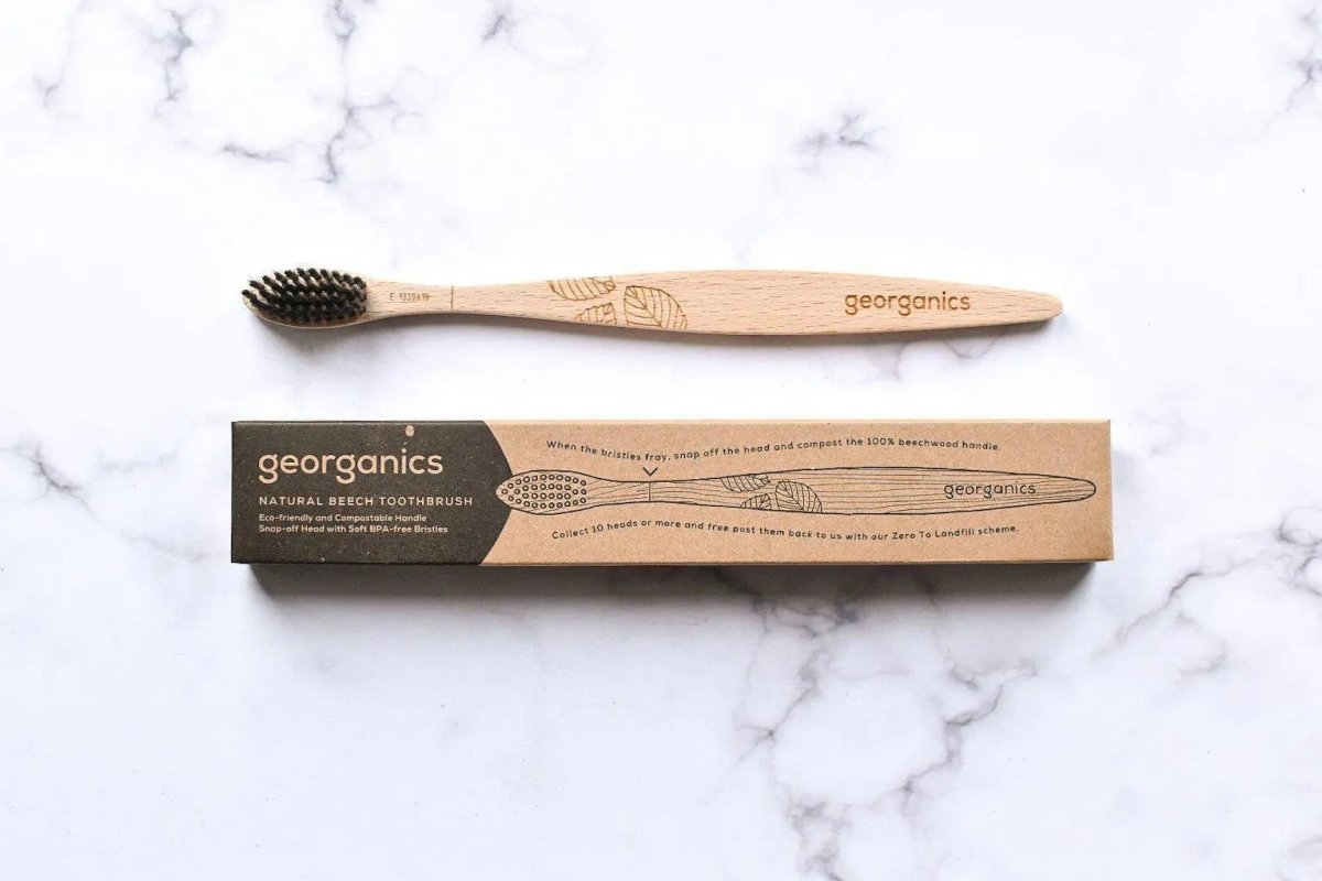 The handle is sustainably sourced beechwood - compostable at end of life, with every tree cut down replanted and excess wood used to heat the factory. The snap-off head uses BPA-free nylon bristles, which can be freposted back to Georganics for recycling via their Terracycle partnership.