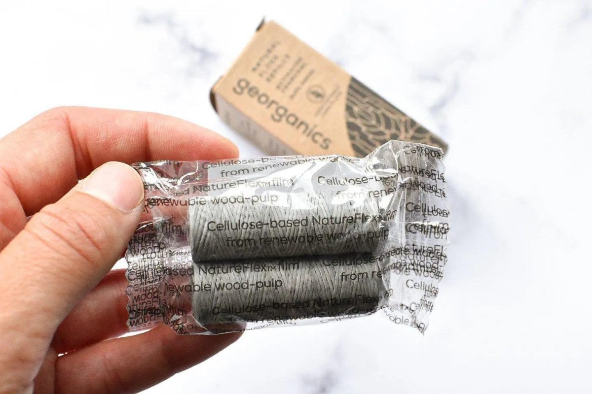 This natural dental floss is made from compostable Corn-base PLA, coated with Vegetable Wax and organic Spearmint/Peppermint Oil.